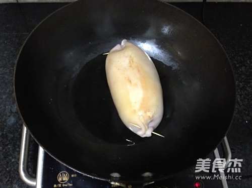 11蒸好的鱿鱼放入油锅,放入适量生抽,焖至表面上色