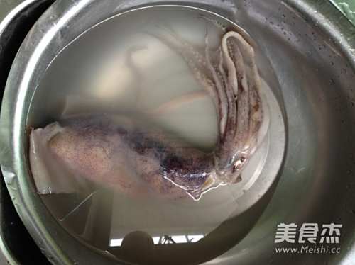 10鱿鱼上面的开口也用牙签插好封口,处理好的鱿鱼放入蒸锅,蒸熟