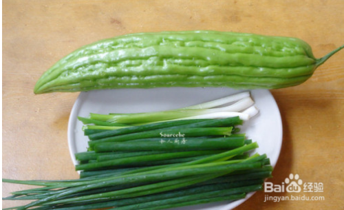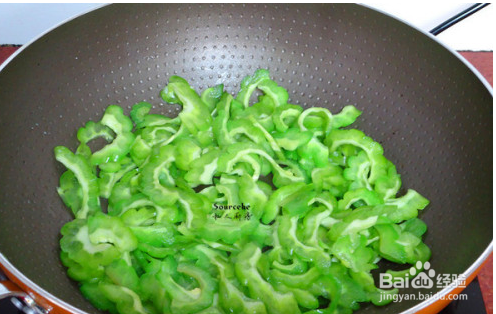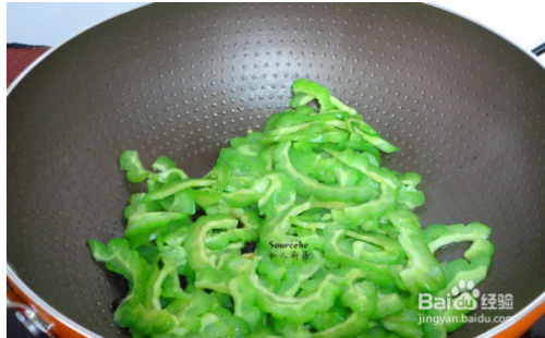 3.改为大火,加入炒过的苦瓜,放盐、葱炒均即可。