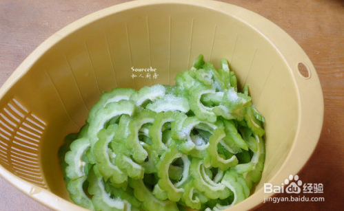 苦瓜去籽,切片,放盐腌制3分钟,洗去盐,沥干水;