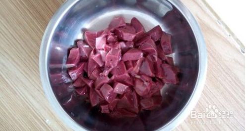 把鸡肝洗净,切成小丁。在清水中倒入几滴醋稍微泡一下。
