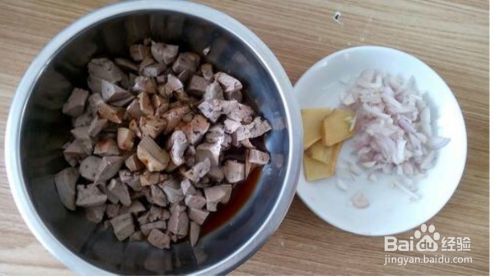 泡好的鸡肝丁,用开水焯一下,切点生姜片,把葱切成碎末备用。