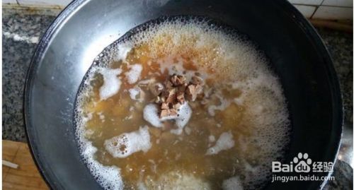 把米煮到快熟了时,放入焯熟的鸡肝,倒几滴料酒,再倒一大勺海鲜酱油,放入生姜片。
