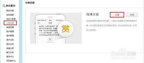 选择左侧的“付费设置”。对微博打赏进行设置:
