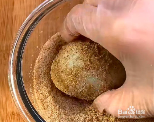 泡好白酒的鸭蛋就直接把它放入前面准备好的盐和五香粉碗中,把鸭蛋均匀地裹上一层盐和五香粉。