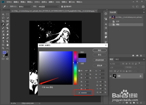 如果我们打开颜色面板可以看到数值越大,颜色越接近白色,数值越小颜色越接近于黑色,而阈值色阶就是的值越大就越接近白色,所以图像中黑色就越多,阈值色阶越小,分界线越靠近黑色,图像中白色就越多。