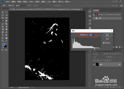 通过图像菜单调整命令打开阈值属性面板,调大阈值色阶,图片中黑色增多,减少阈值色阶,白色增多。