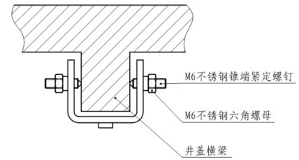 如下图示,将U型槽钢使用M6尖端顶丝夹紧固定于井盖横梁上,待完全夹紧后,拧紧六角螺母将其锁紧。