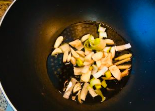 起锅烧油,待油烧制6成热的时候加入葱姜蒜炒香。