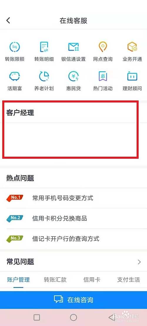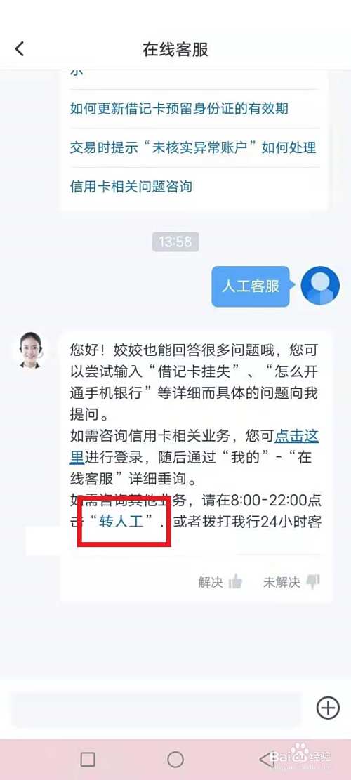 拨打热线电话键盘按键选择人工服务,输入个人卡号等待接听。交通银行软件在线客服,发送人工客服点击转人工。专属客户经理在线咨询。