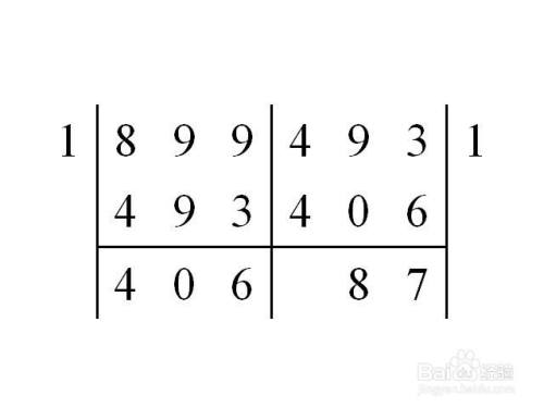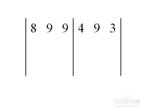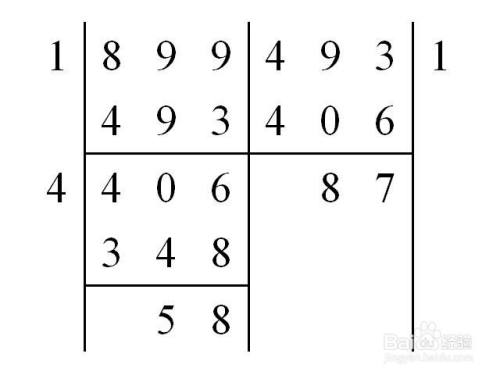 以大数899作为被除数,以小数493作为除数,899中有1个493,在899左边写1,899-493余406,演算过程如图: