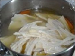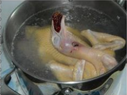 3鸡清洗干净,放进开水锅里浸熟,撇干净浮沫;