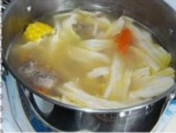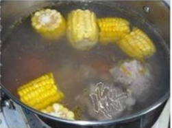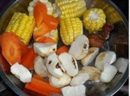 4捞起鸡,把猪骨,马蹄,玉米,胡萝卜放进锅里,大火煮开后,转中小火煮1.5个小时;