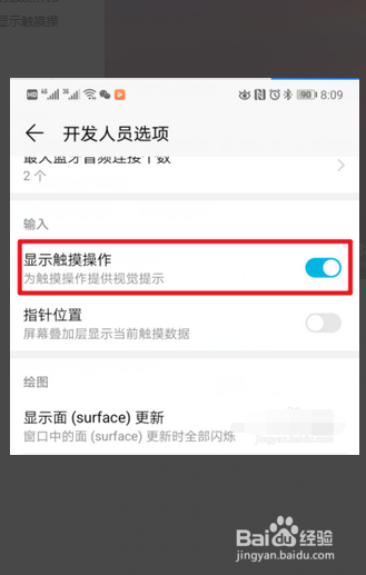 可以看到显示触摸操作这个选项后方的开关处于打开的状态,点击该选项后方的开关,将其关闭即可关闭触摸时的小圆圈。
