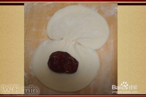 第四步,夹好的面皮会呈现成两个半圆相连的样子,取一个大枣放在其中一个半圆上。