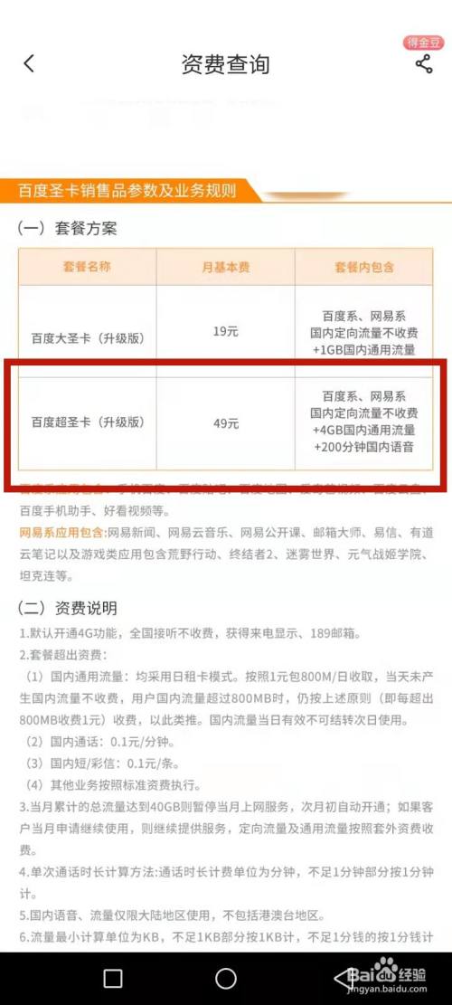 找到49元套餐,显示包含定向流量,通用流量和语音时长等详情。