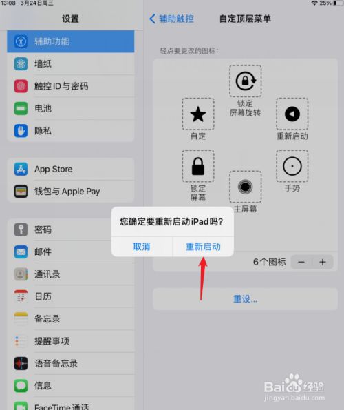 在弹出提示内,点击重新启动的选项,即可重启ipad。