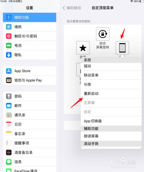 点击辅助触控的小圆圈,选择重新启动的图标。