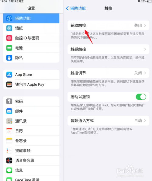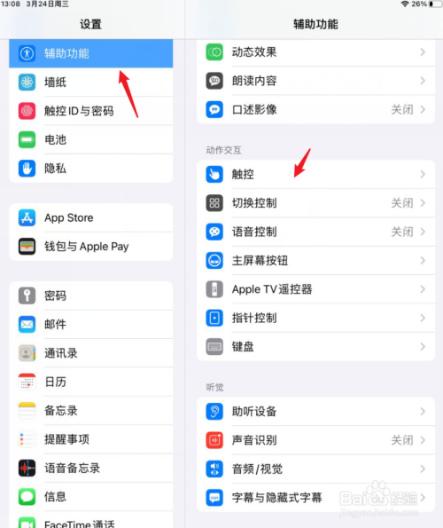 进入ipad设置后,点击辅助功能,选择右侧的触控选项。