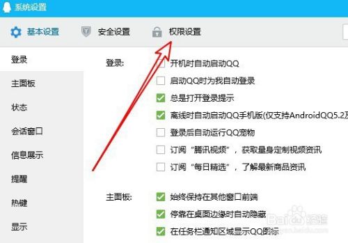 3、这时会打开QQ的设置页面,在页面中找到使用权限的选项卡。