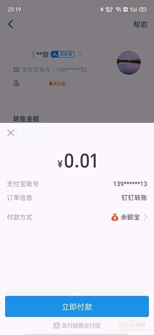 弹出支付页面,点击 立即支付,输入支付密码或验证指纹,完成支付,这样就转账成功了。