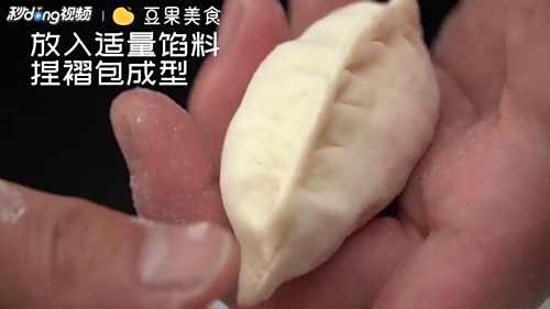 13放入适量馅料捏褶包成型。