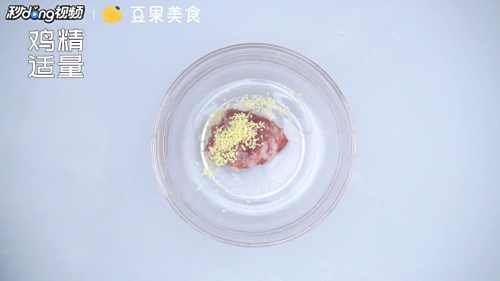 1将准备好的猪肉馅倒入碗中,倒入鸡精。