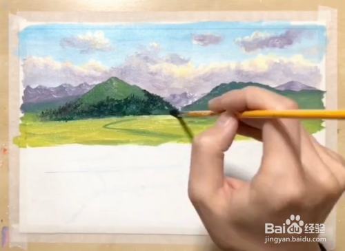 接着,我们选用绿色浦南等颜料给他进行绘画出连绵不断的山脉和草地。