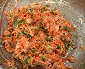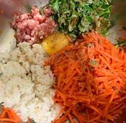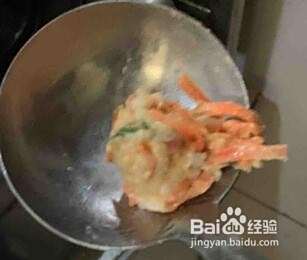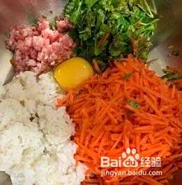 将切好的猪肉胡萝卜香菜米饭翻入盆中,打入一个鸡蛋,备用;