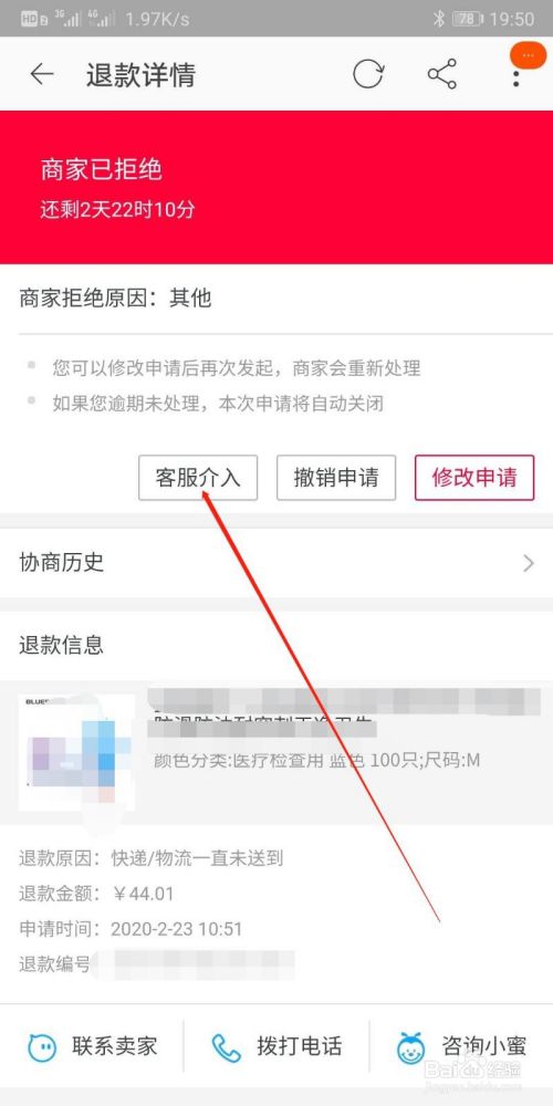点击退款中,接下来点击客服介入就可以。后面客服会给我们来电,咨询具体问题,根据具体事情来决定是谁的责任,由谁来负责。这个界面是卖家拒绝我们之后才会有的哈。