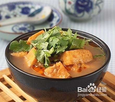 9、煮好的豆腐盛入碗中,浇上芝麻酱、辣椒油、撒上香菜和葱末拌匀就可以吃了。(我觉得直接将芝麻酱、辣椒油、香菜和葱末都放入锅中搅匀再关火虽然卖相差点,但是味道更好)