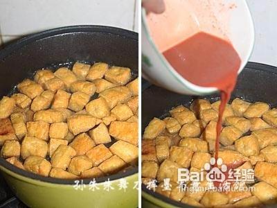 4、中小火将豆腐炸成金黄色捞出,炸豆腐的时候刚开始千万不要在锅里用筷子等搅动豆腐,以免碰碎豆腐,等到豆腐结硬壳时再搅动就没关系了,不会粘在一起的;