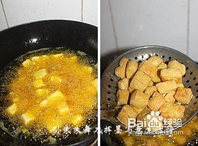 3、将锅中油烧热(用筷子伸进油锅中,筷子周围有密集的泡泡就可以了),将切好的豆腐块放入油锅中;