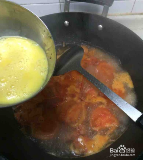 待番茄汤烧开,保持大火,放入打散的鸡蛋。放鸡蛋之前,可以尝一下味道,觉得太淡可以补一些盐,建议淡一些,让汤的口感浓郁但是清爽。