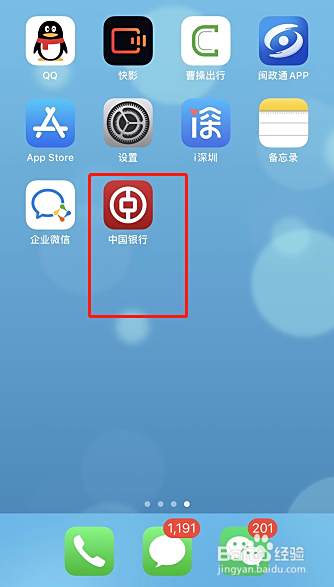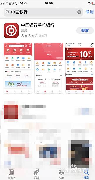 进入APP STORE搜索〔中国银行〕,点击中国银行手机银行进行下载,如图所示: