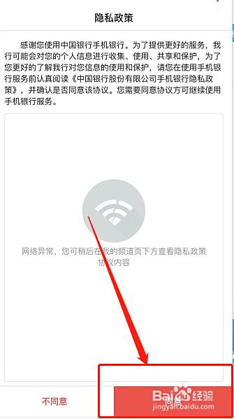 进入中国银行手机银行APP隐私政策页面,点击右下角的〔同意〕,如图所示: