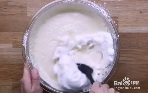 把之前蛋黄的那一碗倒入面粉中搅拌均匀。