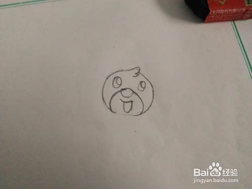 我们再把它俏皮的圆脑袋画出来,然后再把开口笑的嘴巴和头顶的一撮毛也画出来。