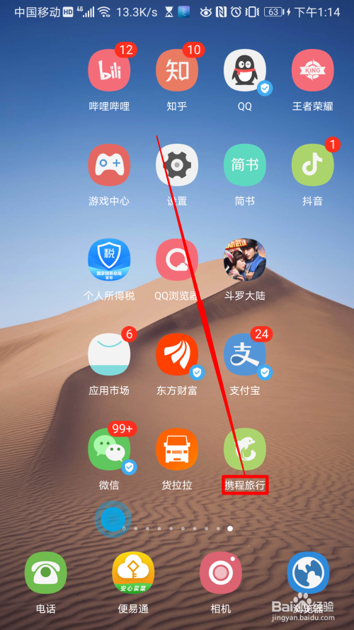 打开手机进入后,点击 携程旅行 。由于色彩或者亮度的原因,可能不容易找不到,请多一些耐心。