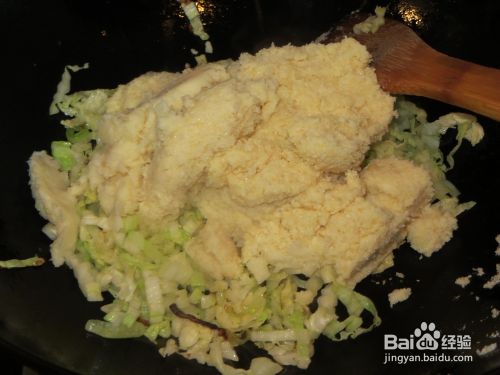 等白菜刚炒熟,就倒入豆渣一起翻炒几下,然后煮一会儿。小白菜不要炒太长时间,不然口感不好,营养也流失的多。煮的时候如果比较干一定要加点水。