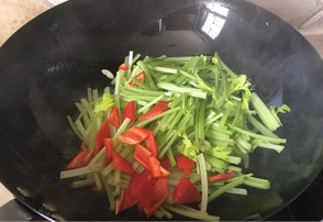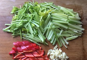 香芹切段,红椒切条后斜切,大蒜拍碎