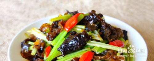 准备材料,香芹洗净去叶,黑木耳洗去泥沙剪去根部。喜欢吃香芹叶子可以不去哈