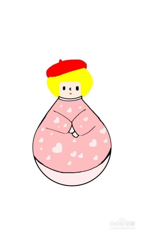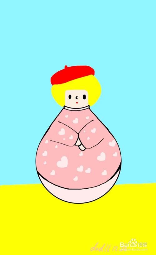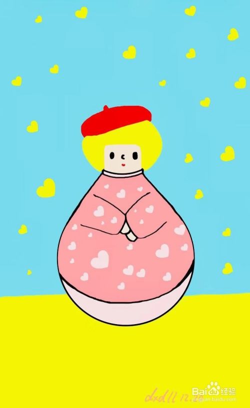 黑色画笔给娃娃画出下半身的身体轮廓,用笔画出娃娃的袖子和双手。电容笔选择桃粉色画笔,使用油漆桶工具,给女孩的服装上色。电容笔选择粉色画笔,在服装上画出一些桃心图案作为点缀。电容笔选择蓝色画笔,使用油漆桶工具为背景图层上色。电容笔选择黄色画笔,画出背景图层的桃心图案,并给其地面上色。