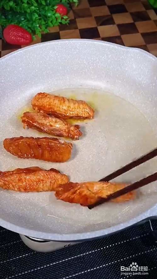 将鸡翅放入平底锅煎至金黄,另起锅加入10克蒜末