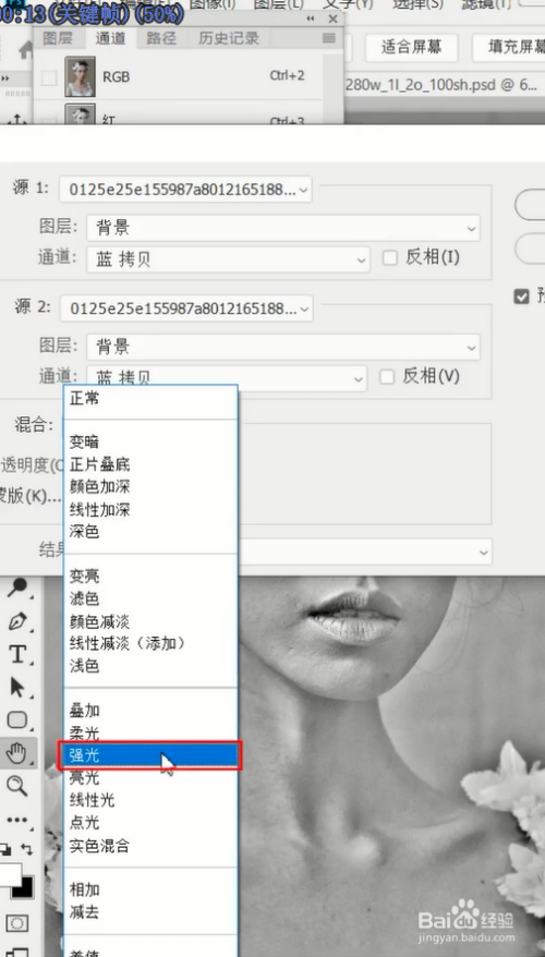 点击图像中的计算混合,这里改为强光,重复三次操作。