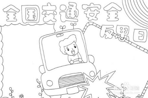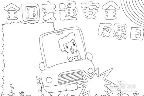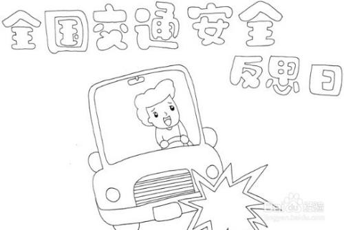 首先在上方画上报头文字“全国交通安全反思日”,下面画一辆出现交通安全事故的小汽车,里面画出小小的司机,在汽车的右边画上一个爆炸的形状。