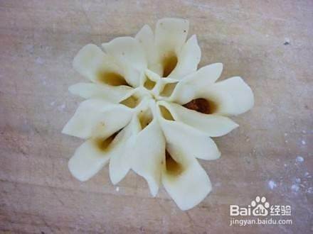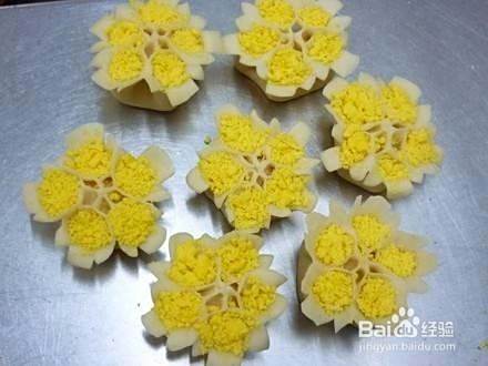把熟蛋黄碾碎,放入花瓣中作点缀