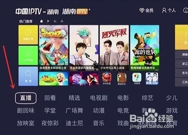 点击电视,就能进入iptv的首页了,然后点击“直播”。如下图所示: