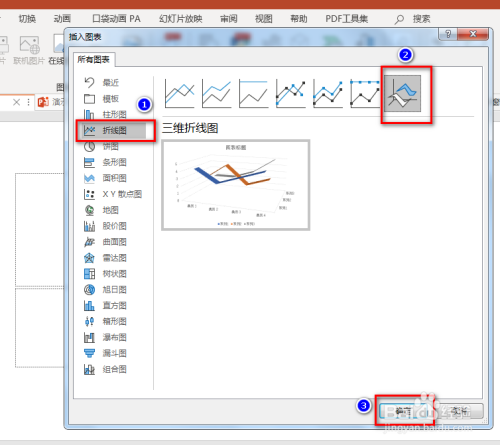 弹出的面板中左侧选择折线图,右侧选择三维折线图,选择完成后点击确定;