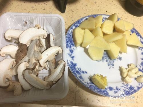 首先,把材料都切好,土豆切块,姜、蒜和香菇切片。